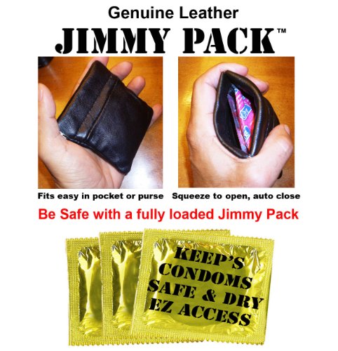 New Palm size black leather condom case. Jimmy Pack keeps your condoms clean and safe. Discreet, stylish condom case holds 4 condoms. Easily pops open and has auto close so no condoms ever fall out. Practical item to have when that special time is either planned or spur of the moment. Always play safe and be one step ahead with a fully loaded Jimmy Pack. Read more...